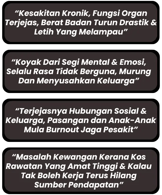 Tiada kesan sampingan. Yang mungkin ada ialah “healing cirisis” di mana badan sedang melalui jangkamasa pembersihan dan pembinaan semula. Lepas keluar semua toksin dalam badan, barulah badan akan jadi sihat